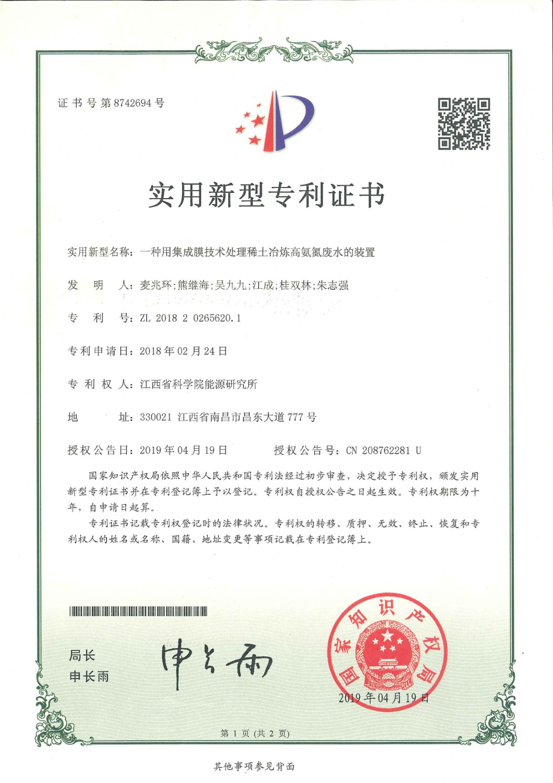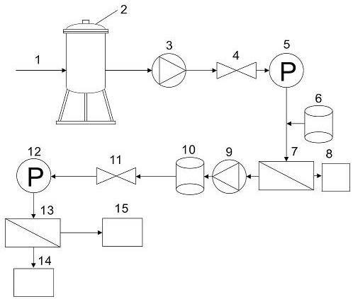 一种用集成膜技术处理稀土冶炼高氨氮废水的装置,所述装置包括依次连接的粗过滤装置(2)、超滤进料泵(3)、超滤压力阀(4)、超滤压力表(5)、络合剂水箱(6)、超滤浓缩液罐(8)、超滤膜组件(7)、反渗透进料泵(9)、pH调节罐(10)、反渗透压力阀(11)、反渗透压力表(12)、反渗透膜组件(13)、反渗透产水罐(14)和反渗透浓缩液罐(15)。本实用新型装置不仅有效解决了离子型稀土工业废水的处理以及达标排放问题,而且能够回收利用其中的氨氮,具有分离和回收效率高、工艺简单、操作方便等优点,在稀土工业中有很大的发展潜力和广阔的应用前景。本实用新型适用于稀土冶炼高氨氮废水的处理。