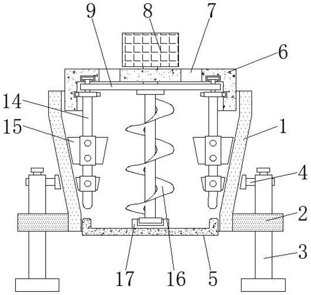 本实用新型公开了一种用于人工湿地植物基质生产的混料一体搅拌装置,包括框架,框架的下端表面外侧安装有安装板,且安装板的内部连接有支撑柱,并且支撑柱的上端内侧贯穿有固定板,框架的下端内侧设置有底板,且框架的上端内侧连接有顶板,顶板的外侧表面开设有通孔,且顶板的中部上端表面连接有电机,电机的下侧连接有转杆,转轴的下端安装有转盘,转盘的下端安装有竖杆,且竖杆的下部外侧套有刮板,转杆的中部下端安装有内搅拌杆,且内搅拌杆的下侧和底板相互连接,并且内搅拌杆和底板的连接处设置有防护垫。该用于人工湿地植物基质生产的混料一体搅拌装置,能够将框架内部残留的原料进行清洁,提高了该装置的实用性。