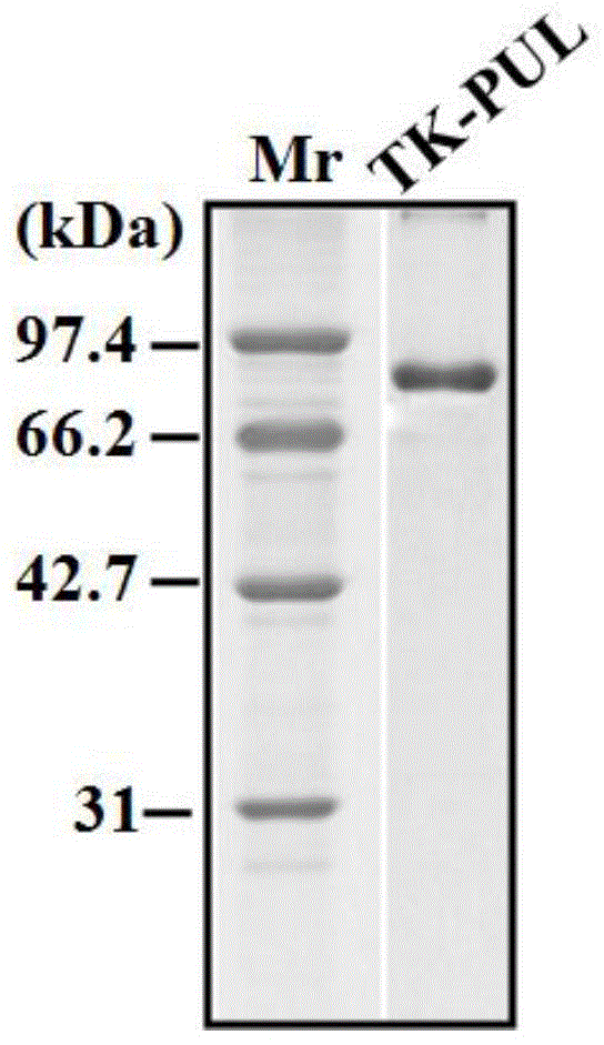 该发明公开了一种利用酶解协同压热处理制备的高益生性莲子抗性淀粉及其制备方法和应用,属于抗性淀粉技术领域。所述制备方法包括以莲子为原料提取莲子淀粉,采用酶解协同压热处理,获得所述高益生性莲子抗性淀粉;所述酶解是采用III型普鲁兰水解酶TK‑PUL对所述莲子淀粉进行酶处理,所述III型普鲁兰水解酶TK‑PUL是通过将包括SEQ ID NO.1所示序列的重组质粒转化短小芽孢杆菌,由转化后的短小芽孢杆菌的发酵产物中获得。本发明的制备方法能够提高莲子抗性淀粉的得率,制备的莲子抗性淀粉具有显著的体外益生元效应,是一种具有潜在应用价值的益生元。
