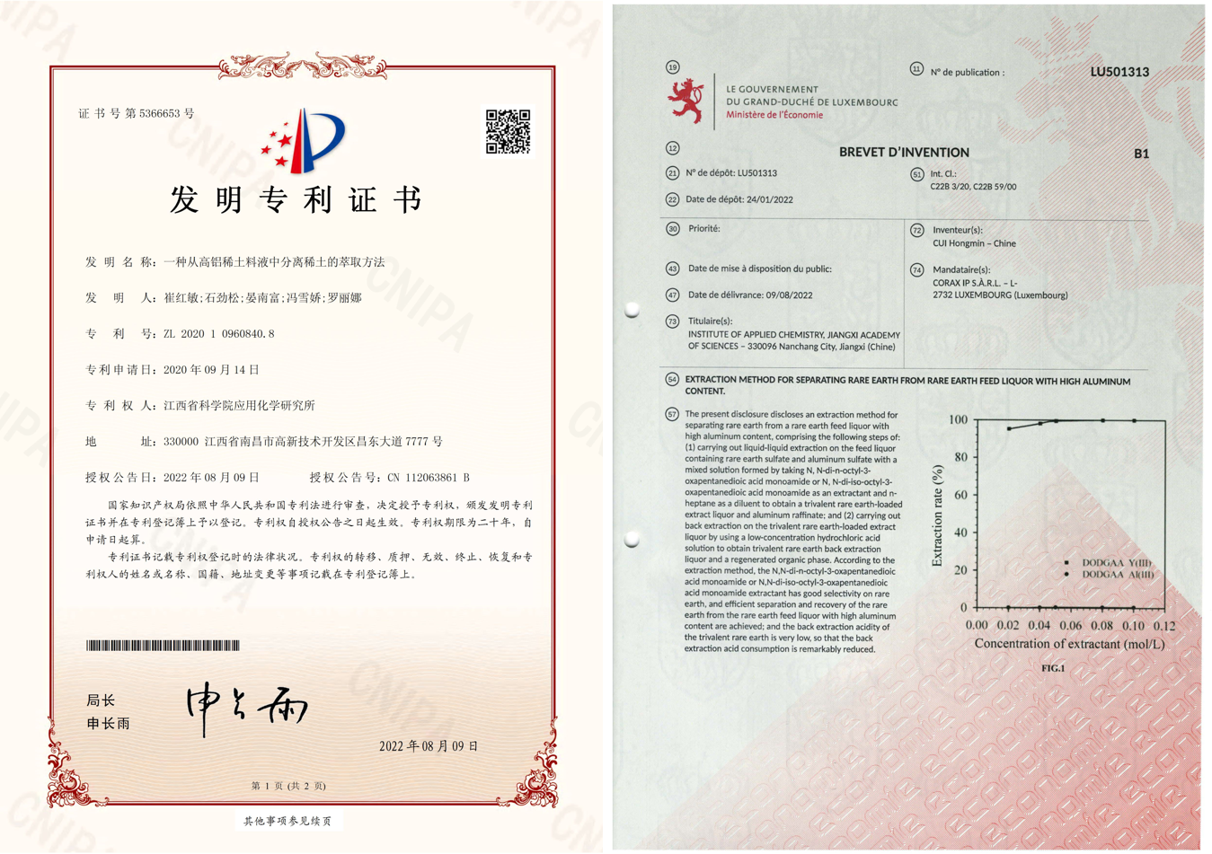 本项目通过研发新型高效的二酰胺荚醚类稀土萃取剂和萃取分离新工艺,实现了稀土和铝的高效分离,使得浸出液中稀土回收率不低于98%,萃余液可作为浸矿剂循环使用,具有极高的推广应用价值;项目申请发明专利3项,其中授权1项国家发明专利,1项欧洲专利,获批国家自然科学基金1项;发表SCI一区论文1篇。