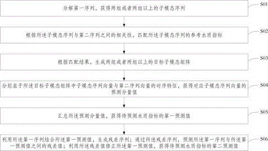 本发明涉及湖泊水质监测领域,特别是涉及一种湖泊水质预测方法及系统。其中,本发明所提供的预测方法包括如下步骤:分解第一序列,获得两组或者两组以上的子模态序列;根据子模态序列与第二序列之间的相关性,匹配子模态序列的参考水质指标;根据匹配结果,生成两组或者两组以上的目标子模态矩阵;分别基于目标子模态矩阵中子模态序列向量与第二序列向量的时序特征,获得对应子模态序列向量的预测分量值;汇总预测分量值,获得待预测水质指标的第一预测值。本发明通过将非平稳的待预测水质指标数据序列分解成多个相对平稳的子模态序列后再分别进行水质数据预测,极大程度地减少了噪声对预测结果的干扰,能够获得更为精准的水质预测数据。