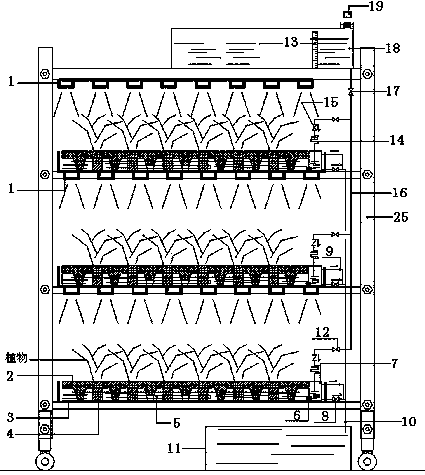 一种调节营养液深度的LED立体家用栽培装置,由营养液供液系统、LED光照系统和栽培系统和支撑架(25)组成。营养液供补系统通过阀门和管道将营养液送至栽培系统;LED将光照提供栽培系统植物生长。栽培系统包括种植格(2)、种植盘(3)、植物定植海绵(4)和水温调节电热丝(5)。每个种植盘的上方都安装了LED光源(1)。营养液供补系统包括营养液箱(18)、联通管(16)、总控制阀(17)、止回阀(15)、侧液箱(7)、溢流管(9)、余液回收箱(11)。本发明不需用电实现营养液的自动补充,同时在一个营养液系统中实现深液流、浅液流以及深浅液层相结合的多种水培方式,使植物能获得全面的营养。本发明省力、简单、安全,适合家庭种植使用。