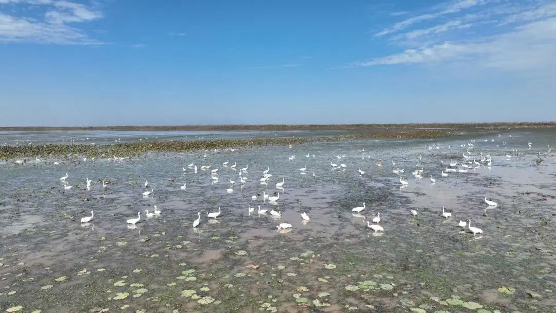“野生莲藕长得越茂盛,候鸟来得就越多、越安稳。”巡护人员介绍,今年湿地内水生植物普遍长势良好,除了常湖的三千亩莲藕,其他湖区的苔草、眼子菜等也蓬勃生长,为候鸟提供了充足且安全的天然食物资源。