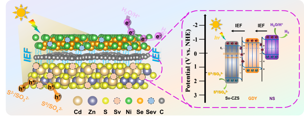 发表在材料科学顶级期刊《Advanced Functional Materials》上的研究,成功构建了一种新型的NiSe2/石墨炔/硫空位-CdZnS三元双S型异质结光催化剂。该工作通过构建独特的双S型电荷转移路径,并创新性地引入缺陷工程与光热效应,协同作用实现了极高的电荷分离效率和反应动力学。界面处强大的梯状内置电场驱动电子定向迁移,而光热元件则将太阳能转化为局部热量,显著降低了水分解的能量壁垒。最终,该催化剂在模拟太阳光和可见光下的析氢速率分别高达167.69 mmol·g⁻¹·h⁻¹和109.67 mmol·g⁻¹·h⁻¹,其表观量子效率在420 nm处达到10.92%,性能超越大多数已报道的CdZnS基催化剂。