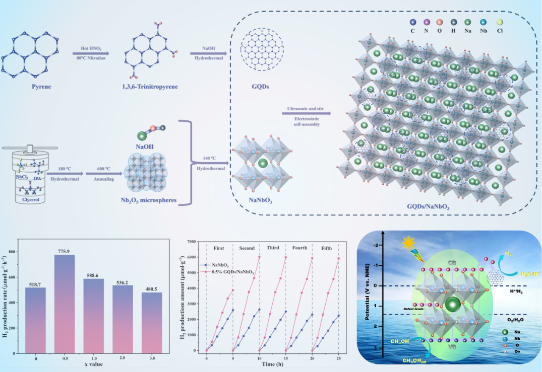 团队在《Journal of Colloid and Interface Science》上报道的石墨烯量子点/NaNbO3异质结光催化剂,展示了一项有趣的新发现。石墨烯量子点的引入成功诱导产生了“动态氧空位”,这不仅增加了表面活性位点,还形成了快速的电子传输通道。尤为突出的是,该催化剂在循环稳定性测试中表现出“循环增强”特性,第二轮循环的析氢活性不降反升。这一特性为设计高效、耐用的光催化剂提供了全新的视角。