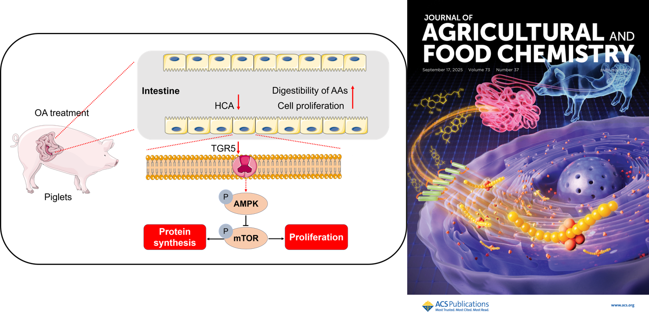 我所动物营养与健康养殖团队翟振亚副研究员以第一作者及通讯作者身份,在国际知名期刊《Journal of Agricultural and Food Chemistry》(简称 JAFC,中文译名《农业与食品化学杂志》)以补充封面论文形式,发表题为 “Oleanolic Acid Regulates Intestinal Cell Proliferation and Protein Synthesis Capacity in Piglets via the Bile Acid-TGR5/AMPK/mTOR Axis” 的最新研究成果。该期刊隶属于美国化学学会(ACS),五年平均影响因子达 6.4,为2025 年中科院大类分区为农林科学一区 Top期刊。