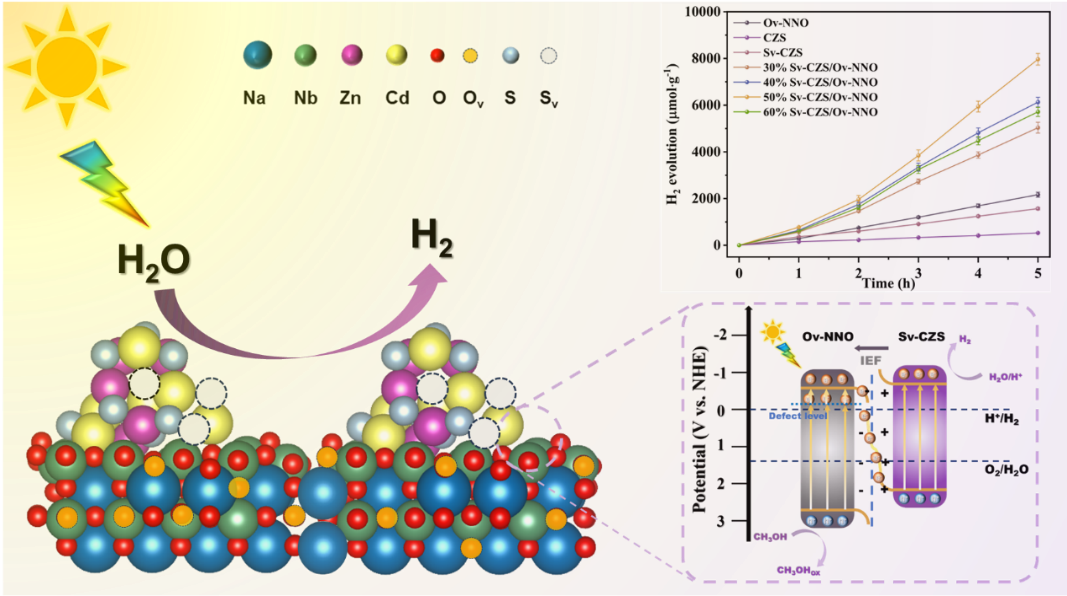 发表于催化领域顶刊《ACS Catalysis》的研究则聚焦于缺陷调控。团队开发了一种具有精准控制硫空位与氧空位的Sv-Cd0.5Zn0.5S/Ov-NaNbO3 S型异质结光催化剂。研究表明,双空位的引入与S型异质结产生了强大的协同效应,不仅显著拓宽了光吸收范围,更增强了内置电场,从而实现了光生电荷的高效分离。该研究为设计新型ABO3多空位S型异质结可见光响应催化剂奠定了重要理论基础。
