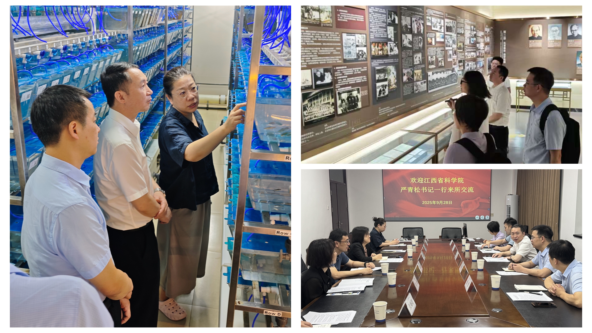 在中国科学院水生生物研究所,该所党委副书记、纪委书记梁琼对严青松一行的到来表示欢迎。她介绍了水生所在研究方向、团队建设、国家级平台建设以及在江西开展合作的情况,表示双方合作前景非常广阔,希望双方科研人员继续密切交流,把合作落到实处,取得更大成效。严青松对水生所长期以来的支持表示感谢。他表示,水生所作为国家级水生生物学研究的重镇,科研实力与管理经验值得江西省科学院深入学习,双方曾围绕江豚保护等技术难题,共同承担中国科学院STS项目等科研任务,人员交流交往频繁,合作成效显著,建立了良好的合作基础。他重点介绍了江西省“1+M+N”科技成果转移转化体系的建设进展与相关政策,诚挚邀请水生生物研究所来赣开展科技合作和科技成果转移转化,支撑服务江西经济社会高质量发展。期间,严青松一行参观了国家斑马鱼资源中心和水生所所史馆。