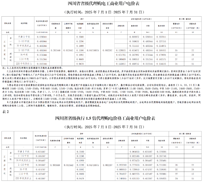 四川省7月省级代理购电、1.5倍代理购电工商业用户电价表如下: