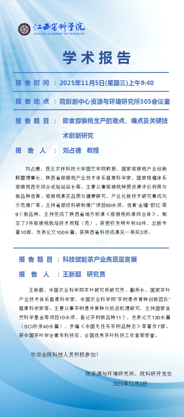 学术报告:即食猕猴桃生产的难点、痛点及关键技术创新研究;科技赋能茶产业高质量发展